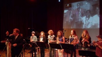 De Five Stars hebben aan het concert van 29 november deelgenomen via een live skype verbinding en zelfs een stukje Moanin’ samen gespeeld met de Jazz Juniors van Muziekschool Amsterdam. (zie foto)