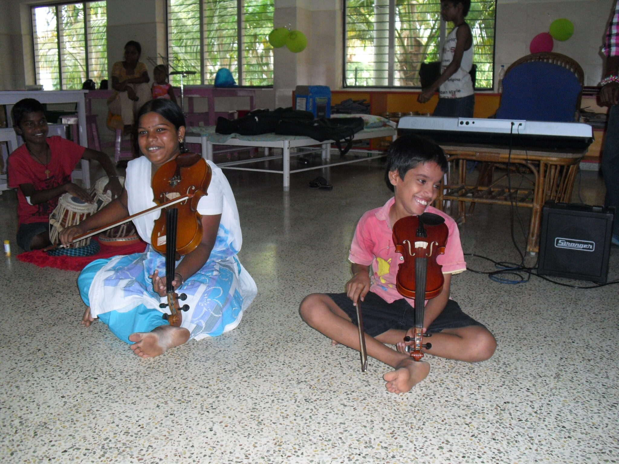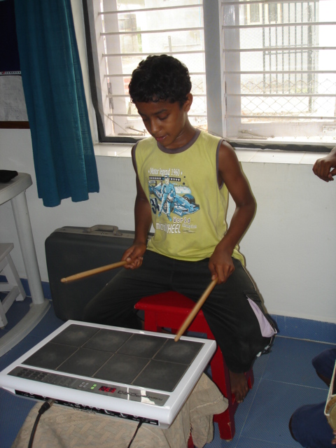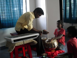 Van 3 tot 8 juni hebben de kinderen van Tulip Garden een groep van 6 jonge muzikanten uit Pondicherry, Tamil Nadu, op bezoek gehad. Deze mensen zijn opgegroeid in het tehuis van de stichting Isai Ma(i)yam en hebben daar muziekonderwijs gekregen. Nu volgen sommigen een muziekopleiding, hebben ze een eigen muziek- en dansgroep waar ze mee optreden en geven ze hun kennis door. Ik heb Isai Ma(i)yam in november bezocht en er enkele saxofoon- en improvisatielessen gegeven. Tijdens mijn bezoek kwam de mogelijkheid om eens met de groep naar Tulip Garden te komen ter sprake. Dat het zo snel zou gebeuren had ik niet durven dromen want Pondicherry en Vijayawada liggen 10 reisuren van elkaar vandaan. Maar voor deze jonge mensen bleek zo’n reis juist een geweldige ervaring. Ze waren nog nooit in een andere staat van India geweest. In Tulip Garden hebben ze niet alleen les gegeven op blokfluit, gitaar en keyboard maar ook op viool, tabla en electronische drumpad, nieuwe instrumenten voor de kinderen.