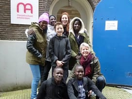 Monique Udo met haar leerlingen uit Oeganda voor Muziekschool Amsterdam