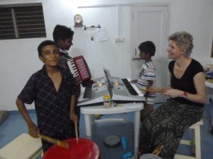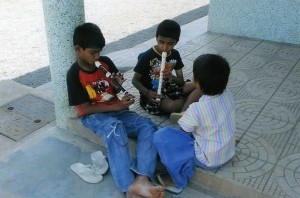 Sai Durga Rao (midden) met Sunil begin 2009, kort nadat ze hun eerste liedjes op de blokfluit hadden geleerd.
